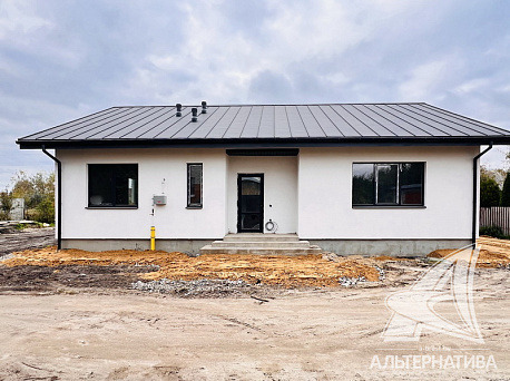 Дачный дом жилого типа под чистовую отделку 2024 года постройки, расположенный в городской черте, в радиусе 70 м от знака "город Брест", в направлении д. Каменица-Жировецкая. Материал стен - газосиликатные блоки 30 см, утепление – пенополистирол 5 см, фасад оштукатурен и окрашен; фальцевая кровля Grand line. Установлены панорамные окна и окна-двери ПВХ во французском стиле фирмы Фамкор (5 лет гарантии). Общая площадь 112,0 кв.м, жилая ~ 63,5 кв.м, кухня ~ 10,0 кв.м. Современный дизайн-проект отличается функциональным использованием пространства. В центральной части дома - кухня-столовая-гостиная 39,1 кв.м, две спальные комнаты и гардеробная размещены вокруг общего коридора, раздельный санузел и топочная. Стены помещений оштукатурены, потолки 3,1 м - без отделки перекрытия, залита бетонная стяжка пола, комбинированные теплые полы.