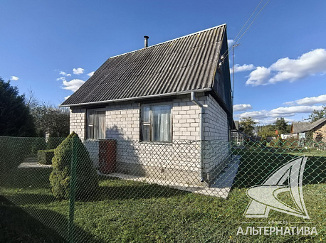 Мансардный садовый домик 1993 года постройки в ближайшем пригороде г. Бреста. Стены из строительного бруса, фасад облицован силикатным кирпичом; кровля – шифер. По плану две комнаты для сезонного отдыха расположены на разных уровнях, есть кухонная зона и веранда. Для внутренней отделки в общем объеме использована деревянная вагонка.