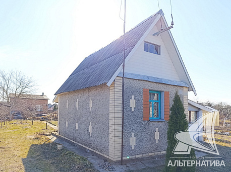 Садовый домик с мансардой 1995 года постройки в ближайшем пригороде Бреста. Стены из строительного бруса, фасад строения облицован силикатным кирпичом; кровля - шифер. Общая площадь 18,7 кв.м. Внутреннее пространство помещений задействовано для сезонного пребывания с учетом функциональности.