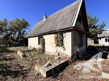 Садовый домик 1978 года постройки в ближайшем пригороде г. Бреста. Дом построен из газосиликатных блоков, двускатная крыша, кровля - шифер. Площадь застройки 26,1 кв.м. Внутреннее пространство задействовано для хранения инвентаря и сезонного пребывания. Требуется ремонт.