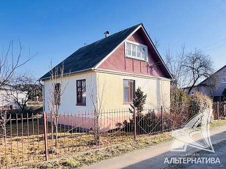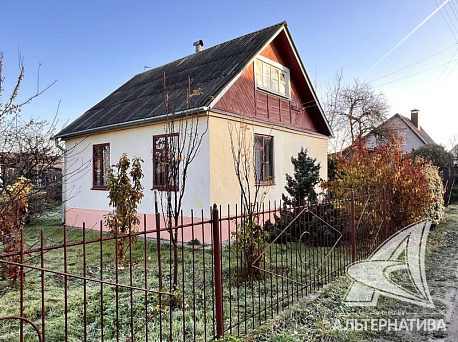 Садовый домик с мансардой 1988 года постройки в ближайшем пригороде Бреста. Стены из газосиликатных блоков, фасад оштукатурен, окрашен, основание строения - ленточный монолитный фундамент; кровля – шифер. Площадь застройки 58,5 кв.м. Типовой проект разработан для четырехкомнатного дома, имеется кухонная зона.