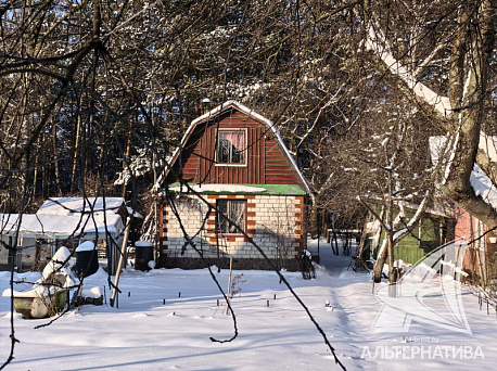Садовый домик с мансардой 1990 года постройки на опушке леса в ближайшем пригороде г. Бреста. Дом из строительного бруса, фасад облицован силикатным кирпичом; кровля - шифер. Общая площадь застройки 36,9 кв.м, жилая 23,7 кв.м. Две комнаты, расположенные на разных уровнях пригодны для летнего отдыха, кухня 8,7 кв.м, коридор.
