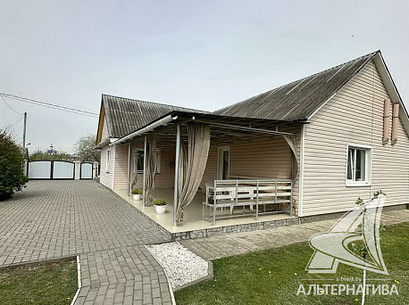 Одноэтажный жилой дом 1965 года постройки в г. Жабинке. Дом из строительного бруса, пристройка - из газосиликатных блоков, утепление - минеральная вата, фасад обшит виниловым сайдингом; двускатная крыша, кровля – шифер. Установлены стеклопакеты, входная дверь – металлическая, комплект межкомнатных белых дверей МДФ. Общая площадь дома 91,6 кв.м. По плану в доме три смежные жилые комнаты, кухня-столовая 22,4 кв.м, санузел, котельная и коридор. Сделан ремонт с использованием материалов хорошего качества: натяжные глянцевые потолки 2,50 м, полы – ламинат, стены оклеены обоями светлых тонов. Санузел облицован современной керамической плиткой, установлена качественная сантехника. Комнаты обставлены встроенной и корпусной мебелью с учетом параметров, со вкусом подобрано декоративно-текстильное наполнение. Летняя терраса под навесом является просторной зоной отдыха.