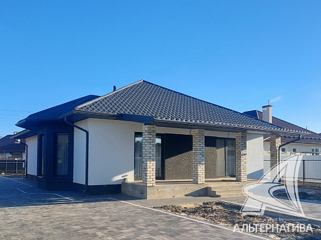 Индивидуальный жилой дом 2024 года постройки в северо-западном микрорайоне г. Бреста. Современный дом со стильной внешней отделкой в контрастном исполнении. Построен из газосиликатных блоков, фасад утеплен пенополистиролом, оштукатурен и окрашен; кровля – металлочерепица. Общая площадь 151,5 кв.м. Планировка разработана для трехкомнатного жилого дома, эркерная гостиная-столовая объединена с кухней 49,8 кв.м, раздельный санузел и группа входных помещений. Просторная терраса с выходом из общей и спальной комнат.