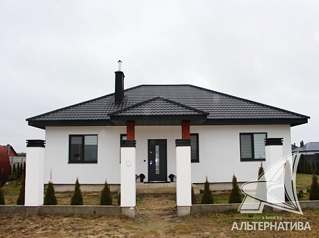 Индивидуальный жилой дом 2021 года постройки в деревне Брестского района. Стены из газосиликатных блоков 30 см, утеплены пенополистиролом 10 см, фасад оштукатурен "американка"; кровля - металлочерепица. Общая площадь 126,7 кв.м, жилая 74,3 кв.м. Функциональная планировка полуоткрытого типа: в центральной части дома размещены гостиная 31,3 кв.м. и кухня 12,1 кв.м, - есть выход на террасу, три спальни и ванная комната сгруппированы рядом, вспомогательные помещения.