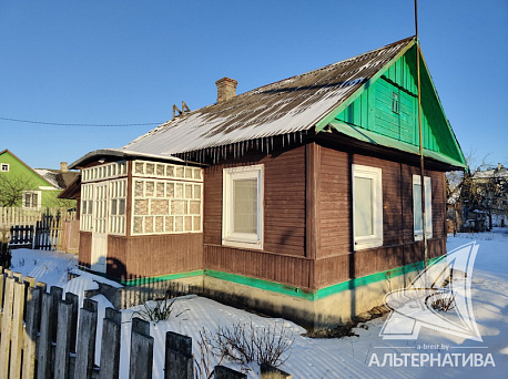 Одноэтажный жилой дом в г. Каменец. Стены из строительного бруса, фасад окрашен; кровля - шифер. Установлены окна ПВХ. Общая площадь 70,4 кв.м, жилая 40,3 кв.м. Смежная планировка: три жилые комнаты с окнами на разные стороны, проходная кухня 9,9 кв.м, вспомогательные помещения. Комнаты в аккуратном жилом состоянии обставлены мебелью. Для внутренней отделки использованы практичные материалы, есть печь. Высота потолка 2,80 м.