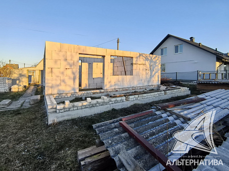 Коробка жилого дома на дачном участке в ближайшем пригороде Бреста. Стены из газосиликатных блоков, основание - ленточный монолитный фундамент, кровля – шифер. В наличии материалы древесины для отделки крыши. Планировка разработана для одноэтажного жилого дома, - выделено функциональное жилое пространство, предусмотрены вспомогательные помещения.