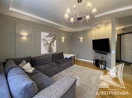 Трехкомнатная современная квартира на седьмом этаже 16-этажного блочного кооперативного дома 2017 года постройки в центре г. Бреста (ул. Фомина). Установлены стеклопакеты нового образца, подоконники во всех комнатах — из искусственного камня. Расположение окон квартиры на две стороны дома — это много света утром и мягкий закат вечером. Входная дверь - металлическая ProfilDoors с шумоизоляцией и антивандальным покрытием; межкомнатные - из массива ольхи. Общая площадь 79,5 кв.м, жилая 49,7 кв.м. Улучшенная зарегистрированная планировка отличается удобством: гостиная-столовая 24,7 кв.м. объединена с кухней, две спальни с балконом, гостиная-столовая 24,7 кв.м. объединена с кухней, два санузла с ванной и душевой. Балкон застеклен (заменены стеклопакеты) и оборудован системой хранения.