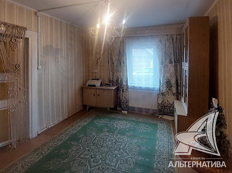Двухкомнатная квартира в блокированном жилом доме до 1917 года постройки в северо-западной части города Бреста. Стены из строительного бруса, отделка фасада - деревянная вагонка; кровля – шифер. Установлены частично окна ПВХ. Общая площадь 45,2 кв.м, жилая 24,0 кв.м. Смежная планировка: две небольшие жилые комнаты, проходная кухня 12,3 кв.м, санузел и прихожая. Комнаты в жилом состоянии: потолки 2,55 м окрашены краской, стены оклеены обоями в совмещенной технике, полы – окрашенная доска. Практичная мебель расставлена с учетом параметров помещений.